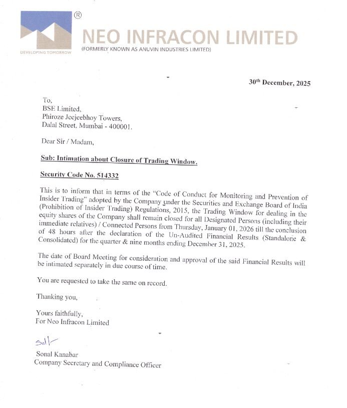 Closure of Trading Window 2025-2026 31.12.2025 30.09.2025 31.03.2025 2024-2025 30.06.2024 30.09.2024 31.12.2024